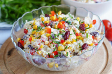 Oprócz sałaty lodowej w sałatce znajdziemy również kurczaka i kilka innych pysznych dodatków, dzięki czemu taką sałatką można się naprawdę najeść. Zapraszam do wypróbowania przepisu!